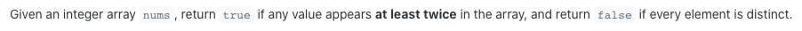 정수형 배열 nums가 주어지고 값이 배열에 적어도 두 번 나타나면 참을 리턴하고 모든 숫자가 고유하다면 거짓을 반환합니다.