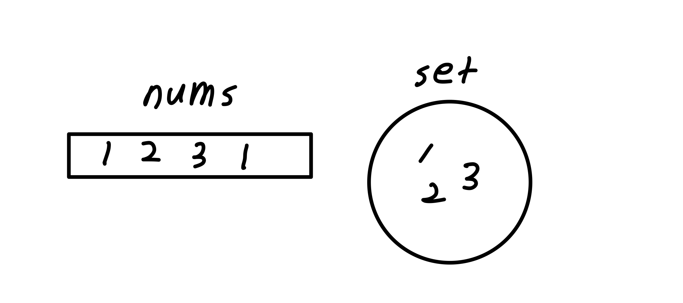 nums를 집합화해서 중복된 숫자가 있으면, set의 개수가 nums의 수보다 작습니다.