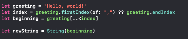 beginning에서는 greeting의 [..<index] 즉 ", "전까지의 문자를 substring 한 Hello를 가집니다.
